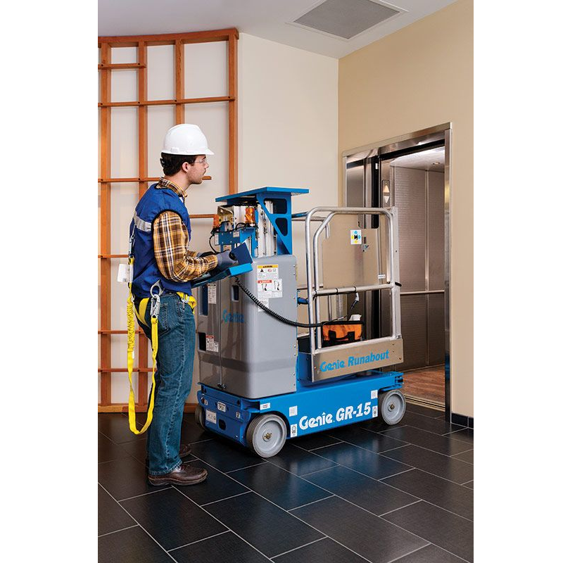 A zero inside turning radius and full elevation drive make the Genie® Runabout® GR™-15 lift ideal for warehousing, transporting, inventory management and general maintenance. Compact and low-weight, it increases productivity on the job thanks to its ability to fit through doorways and in most passenger elevators.