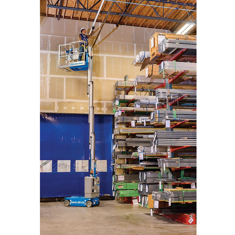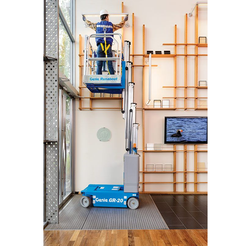 The Genie® Runabout® GR™-20 lift is a compact, low-weight machine that increases productivity on the job thanks to its ability to fit through doorways and in most passenger elevators. It can be driven through doorways with operator on board. A zero inside turning radius and full elevation drive features make it ideal for warehousing, transporting, inventory management and general maintenance.