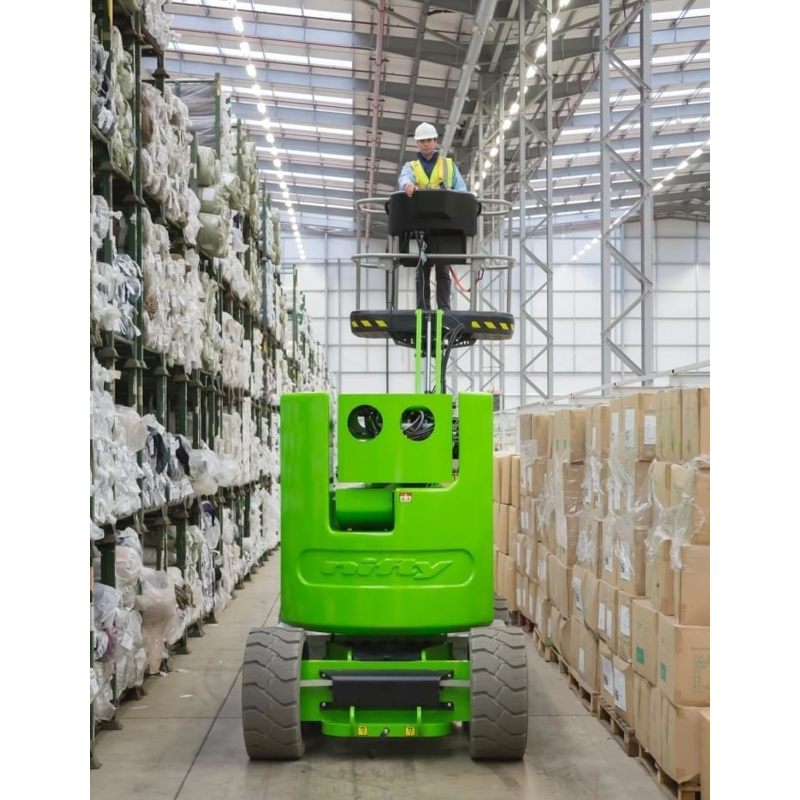 The HeightRider 12 Narrow Electric (HR12NE) is a zero-emission self-propelled work platform from Niftylift. It can be driven from the cage while elevated or lowered and it delivers an impressive working envelope from a narrow-aisle, maneuverable chassis.